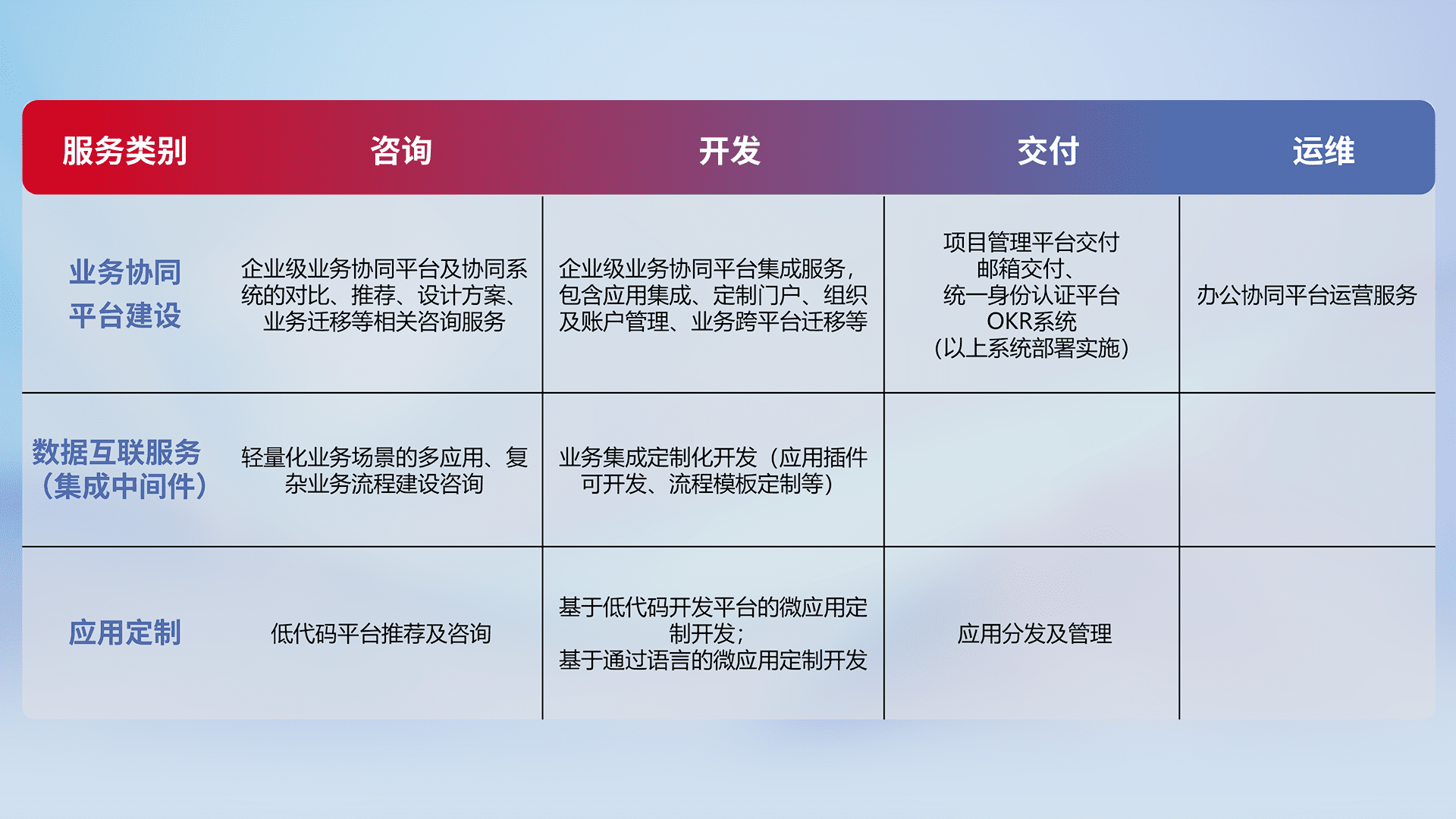 针对钉钉、、企微、、、、IDaas等平台级产品提供产品的规划、、、、方案、、、交付、、、定制化开发等服务,,,,实现如统一协同办公、、智能客户服务、、、、混合会议管理、、、智能数据查询、、等业务场景,,实现数字化转型。。。