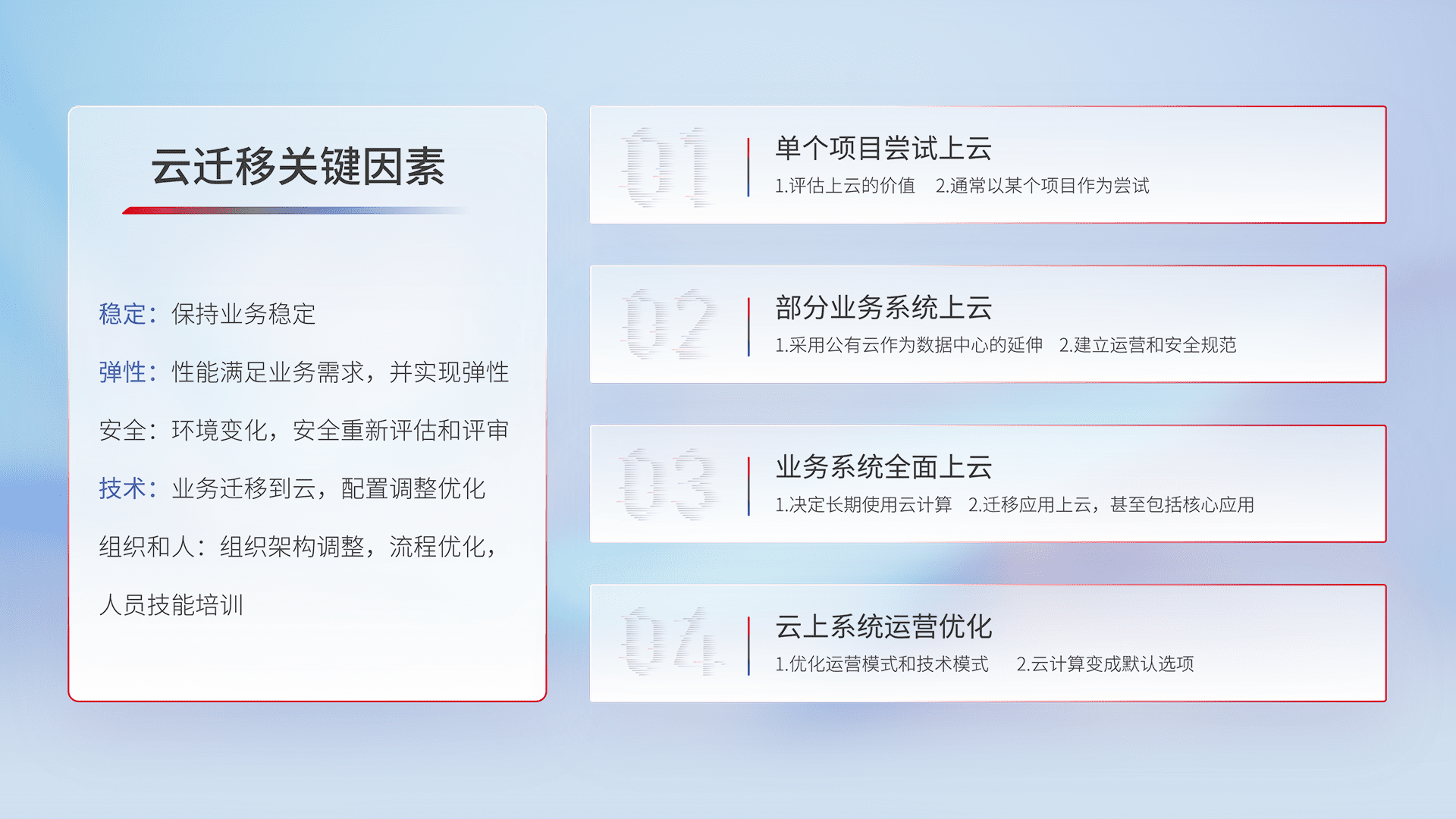 结合实际业务,,从规划设计、、、、云平台选型、、云原生改造、、数据迁移、、、集成交付,,迁移全过程为客户识别最佳上云路径,,,做好风险识别管理,,,,设计网络架构、、身份权限、、、安全审计合规、、、操作审计、、、日志审计、、监控告警策略、、、多站点容灾设计等,,对云上基础设施进行整体规划,,提升IT治理水平,,,,以满足弹性、、、高可用、、、、高性能的需求。。。