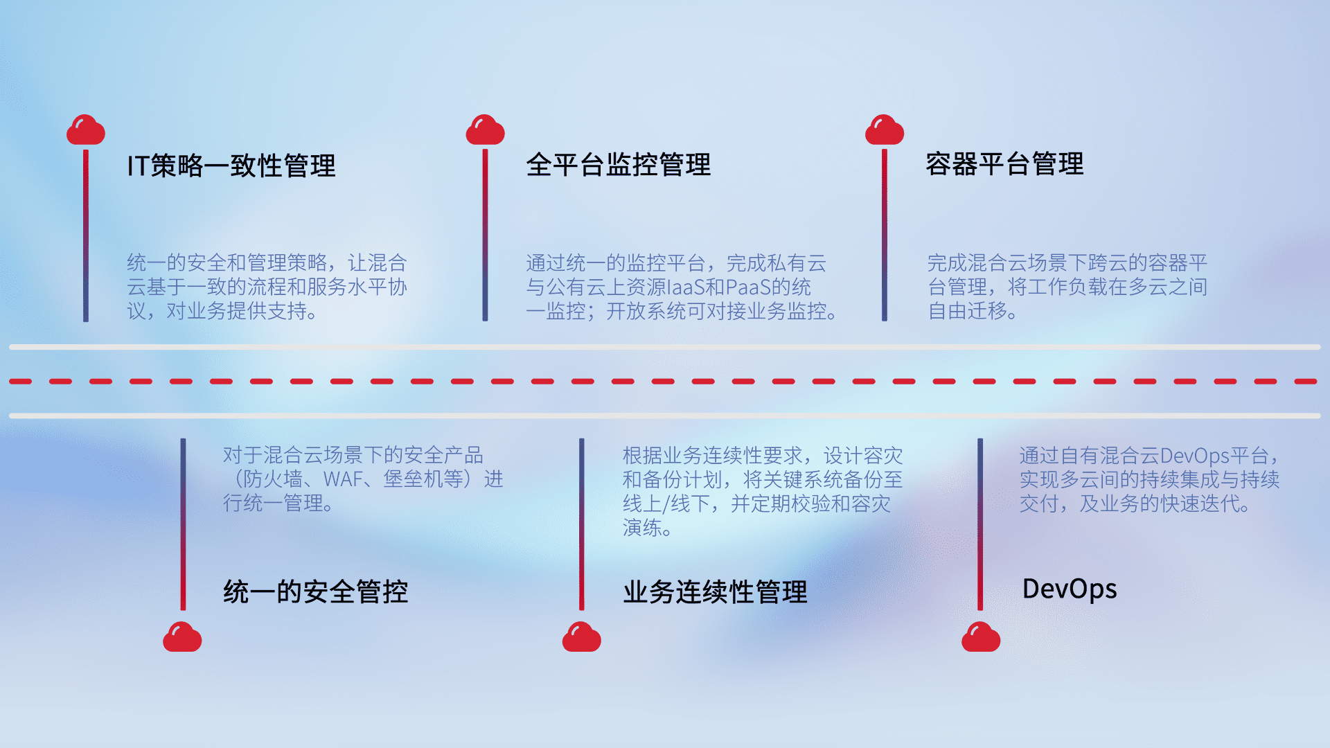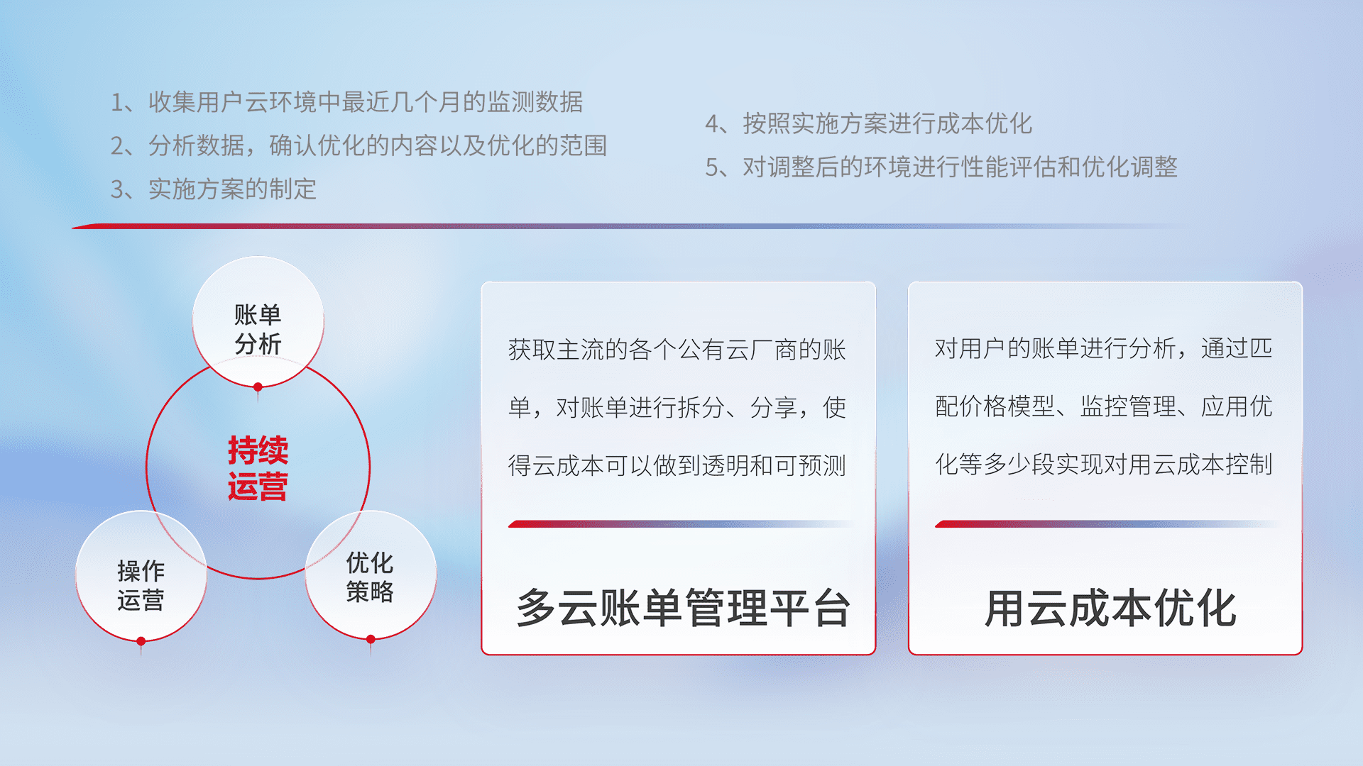 通过多云纳管,,,以统一的资源数据模型把客户的云资源进行抽象和封装,,,进而实现对多云资源的统一操作,,保障云资源管理的可靠性、、稳定性与可用性。。。量身定制化运维内容,,,,配置、、开发运维、、、补丁管理、、、备份、、、监控、、认证和访问管理、、审计和日常巡检等,,,,保障在用云过程中的可靠度,,,,稳定度以及高可用率。。。