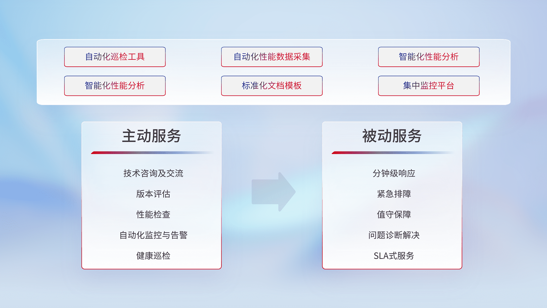 智能化工具和标准化文档,,,,保障服务质量,,,提供主动服务(包含技术咨询、、、版本评估、、、、性能检查、、、自动化监控与告警、、、、健康巡检)和被动服务包含(分钟级响应、、、紧急排障、、、、值守保障、、、、问题诊断解决、、SLA服务)。。。